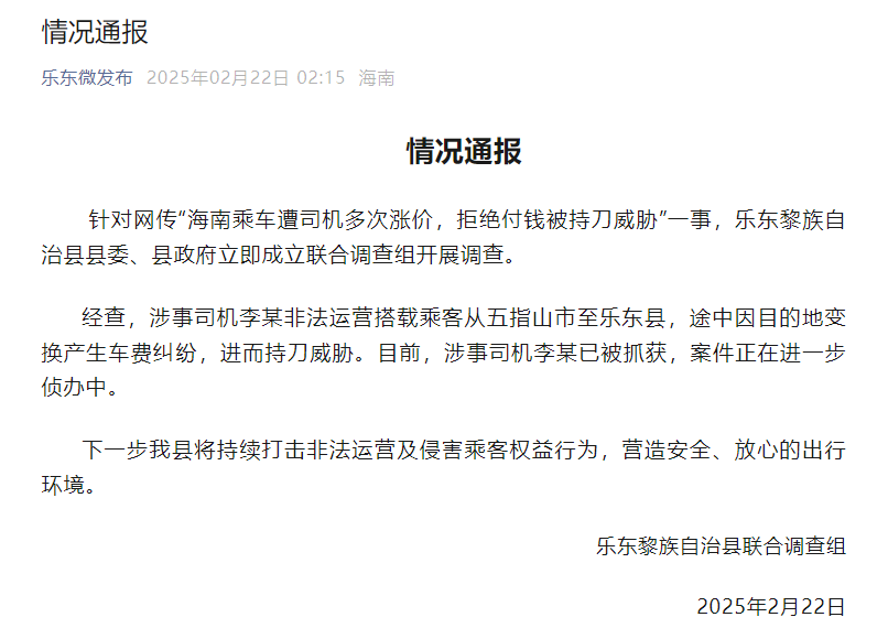 针对网传“海南乘车遭司机多次涨价,拒绝付钱被持刀威胁”一事,乐东黎族自治县县委、县政府立即成立联合调查组开展调查。